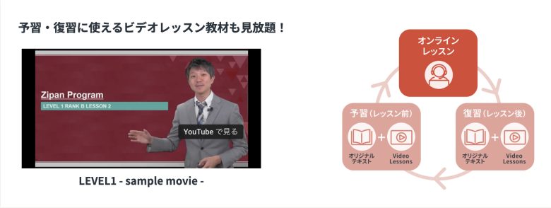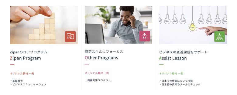 言語としての日本語だけでなく、ビジネス特化型の学習教材で日本の文化、働き方まで学べます。マンツーマンでのオンラインレッスンのほか、予習復習に役立つビデオレッスンを用意。基本的なビジネス日本語を体系的に学べる「Zipan Program」に加え、特定のスキルにフォーカスした 「Other Programs」、ビジネスの直近課題をサポートする「Assist Lesson」も用意されています。