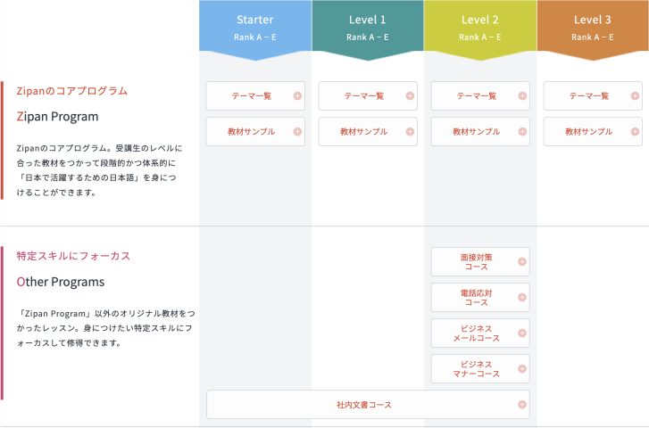 「Zipan」のコアプログラム「Zipan Program」は学習状況に応じて、「Starter」から「Level1」「Level2」「Level3」と4段階にステップアップしていく仕組み。50レッスン×4レベル=計200レッスンの充実した内容です。また「Other Programs」は、面接対策や電話応対など特定スキルをオリジナル教材で学べるもの。日本での仕事について個別の相談ができる「Assist Lesson」とあわせて、ビジネスシーンに必要な日本語力や現場対応力を大きく高めてくれます。