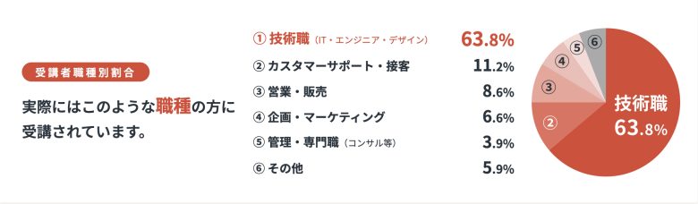IT系、エンジニアリング、デザインなど、いわゆる高度技能人材と呼ばれる技術職の方を中心に、幅広い職種の方に利用いただいています。既に日本企業で就労されている外国人の方だけでなく、内定者のビジネス日本語スキルを集中的に伸ばしたい、という法人様からのニーズ等も多くいただいています。