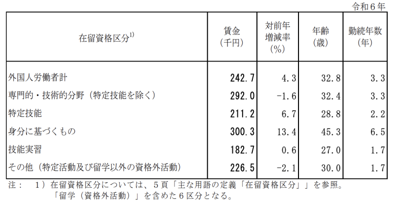 ちなみに、外国人労働者の賃金について、厚生労働省調査による2024年の「賃金構造基本調査」を見てみると以下のようになっている。