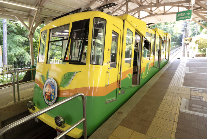 登山口で見かけたケーブルカー。色合いの可愛らしさはともかく、不思議な形をしていて思わず写真を撮りました。……でも、なるほど!この形状こそが、角度を保ったまま山を上がっていくのに適しているというわけですね?!すごい!!!