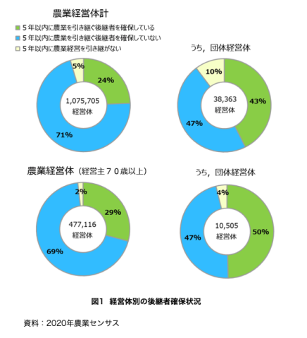 農林水産政策研究所の調べによると、全国の農業経営体を対象とした調査結果から、5年以内に経営を引き継ぐ後継者がいると答えたのは、わずか全体の24 〜 27%程度にとどまることが報告されています。一方、後継者不在を回答した割合は約70%と極めて高く、日本の農業における深刻な担い手不足が明らかです。
