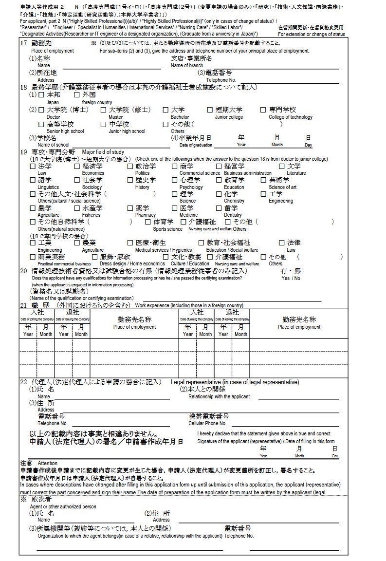 申請書は不定期に改訂があります。気付かずに古い様式で申請してしまうと、受理されなかったり審査に時間がかかったり、最悪の場合は不許可になる可能性もあります。申請書作成時は必ず出入国在留管理庁のサイトで最新版を確認し、古い様式は使わないよう注意してください。
