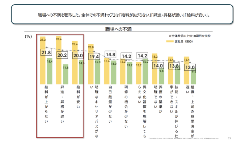 外国人の職場に対する不満として「給料が上がらない」「昇進・昇格が遅い」「給料が安い」などが上位に挙げられます。