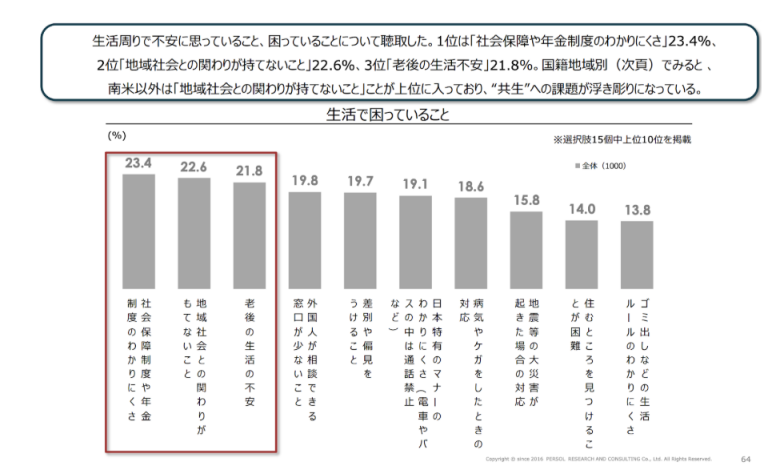 たとえば、「社会保障制度や年金制度のわかりにくさ」「地域社会との関わりがもてないこと」「老後の生活の不安」などのトラブルが上位に入っています。他にも、外国人が相談できる窓口の少なさや、差別・偏見、日本特有のマナーなど、あらゆる場面で生活のしづらさを感じているようです。
