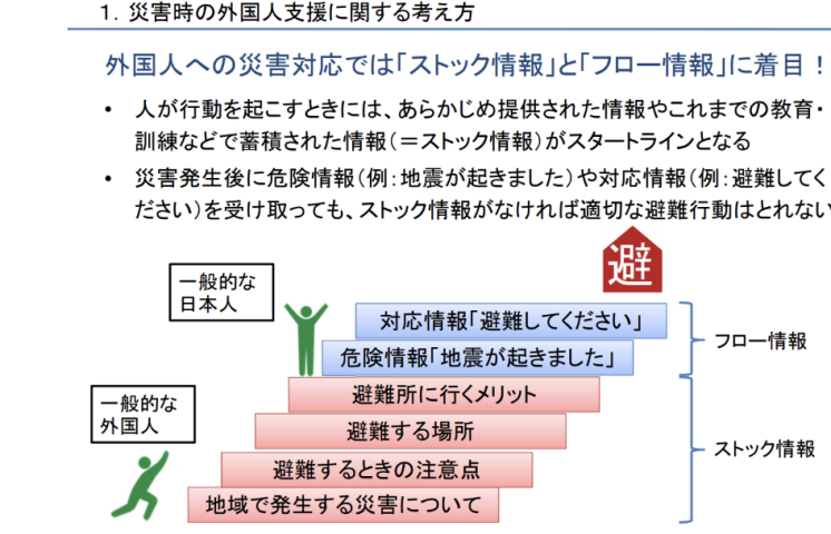 一般財団法人ダイバーシティ研究所の資料によると、外国人への災害対応では「ストック情報(災害に対する前提知識)」と「フロー情報(災害時の情報)」が重要になるとされています。