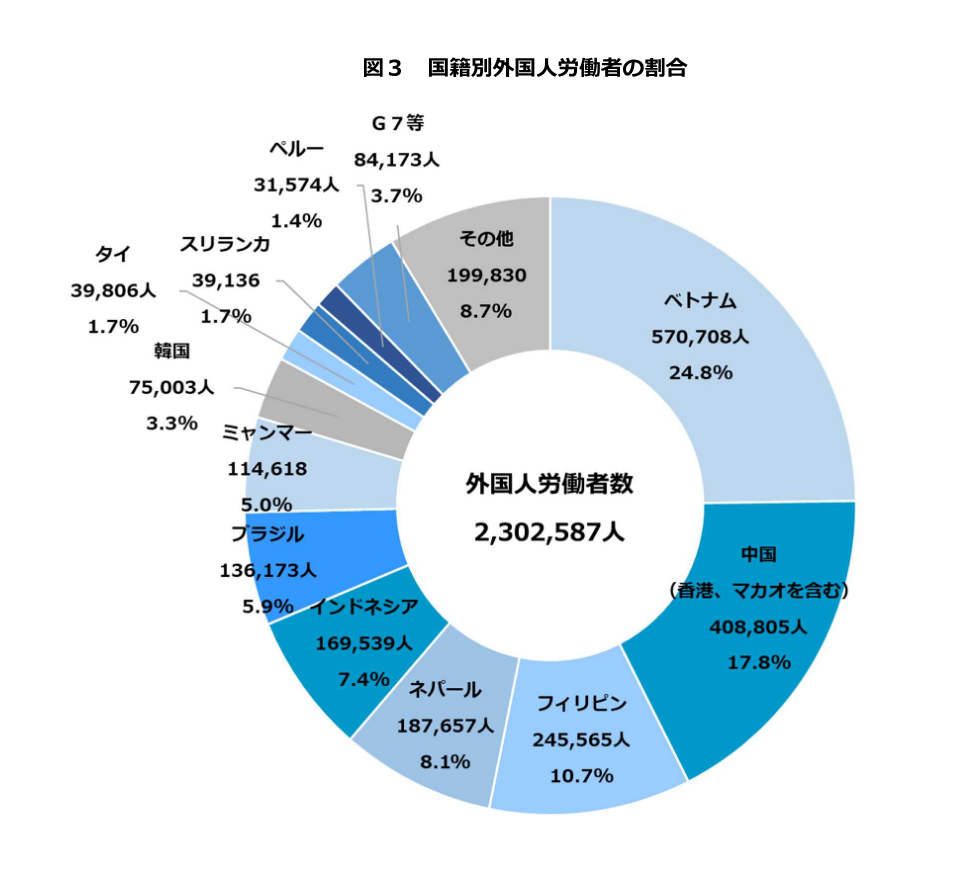 国籍別では、ベトナムが57万708人と最も多く、全体の24.8%を占めています。続いて、中国の40万8805人、フィリピンの24万5565人、ネパールの18万7657人の順です。インドネシア(16万9539人)、ブラジル(13万6173人)、ミャンマー(11万4618人)も一定数の割合があります。