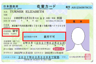 表面:「在留資格」「就労制限の有無」