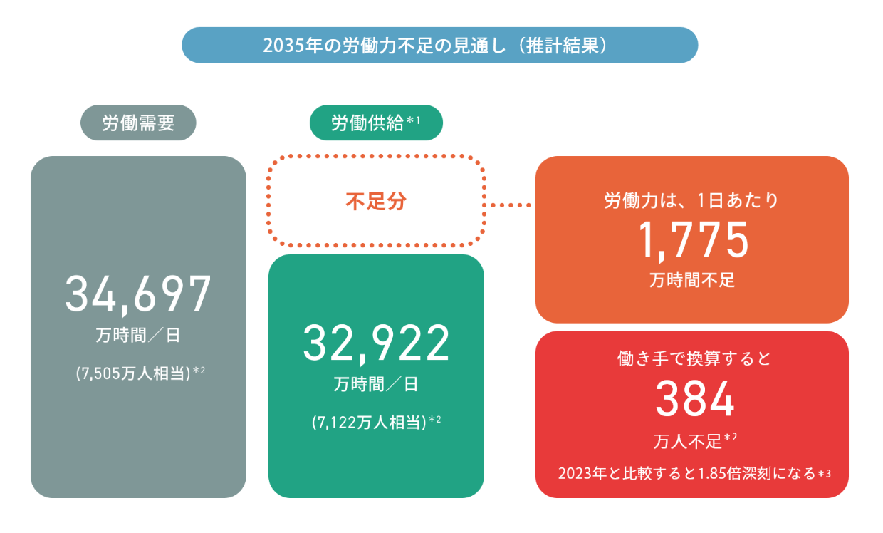 少子高齢化により国内の生産年齢人口は急減しており、2035年には約384万人規模の労働供給不足が発生すると予測されています。