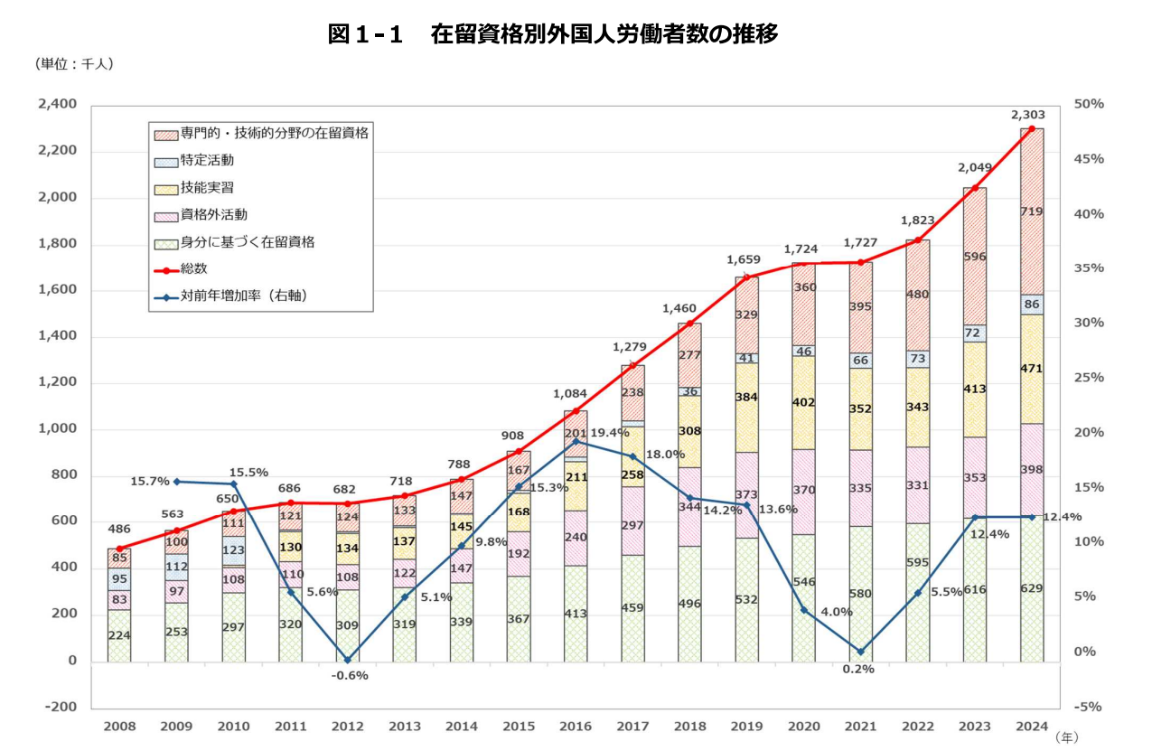 厚生労働省の届出統計によると、日本の外国人労働者数は年々増加しており、令和6年10月末時点で2,302,587人と、過去最多を更新しています。