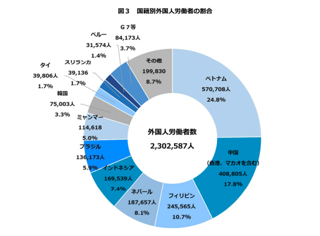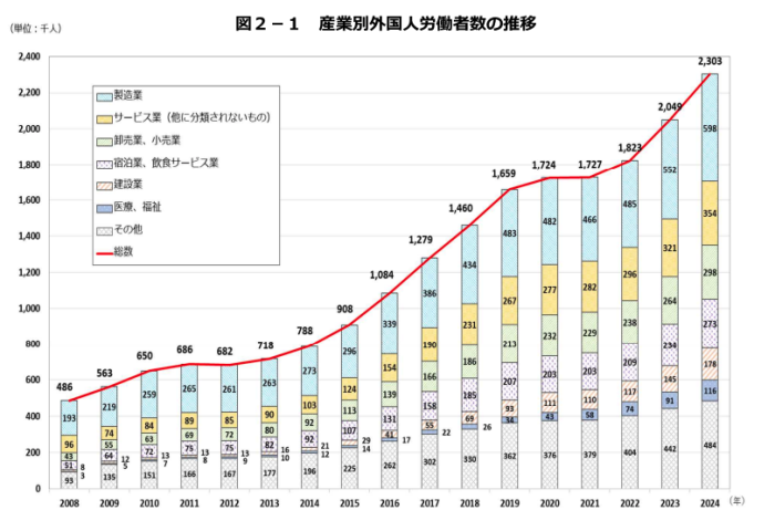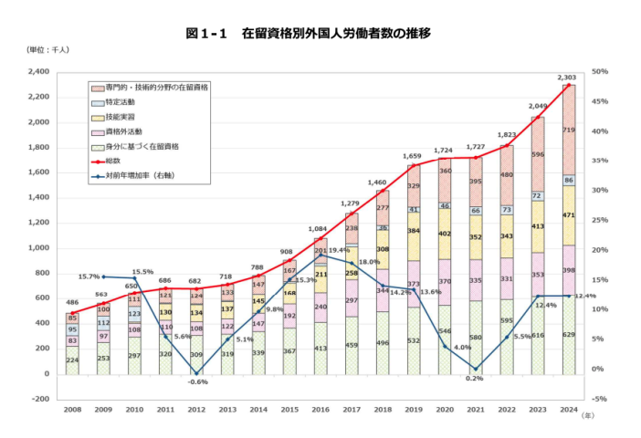 「外国人雇用状況」の届出状況まとめによれば、2024年10月末時点で外国人労働者数は2,302,587人に達し、過去最高を更新し、前年比+253,912人(+12.4%)の急増となりました。