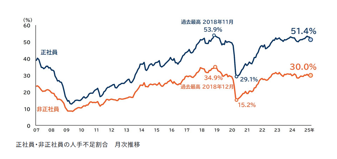 一方、民間調査機関による雇用の過不足状況を調査したデータでは、令和7年4月時点で正社員の人手不足を感じている企業が51.4%、非正社員に対しては30.0%との回答がありました。