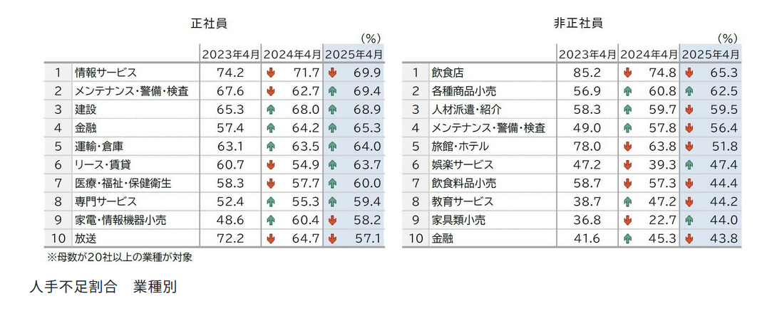 正社員は「情報サービス」「メンテナンス・警備・検査」「建設」の順に欠員率が高く、非正社員では「飲食店」が最も高くなりました。