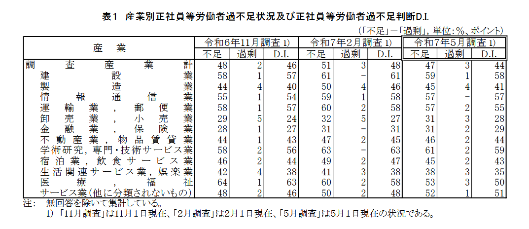 業界別人手不足の状況は、前述の帝国データバンクの「人手不足に対する企業の動向調査(2025年4月)」のほか、厚生労働省の「労働経済動向調査(令和7年5月)の概況」が参考になります。