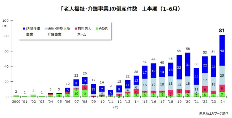 東京商工リサーチの2024年上半期(1-6月)「老人福祉・介護事業」の倒産調査によると、2024年上半期の介護事業者の倒産件数は最多の81件を記録しています。