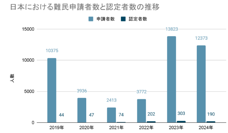 2024年の難民認定申請者は12,373人、そのうち難民として認定されたのはわずか190人でした(参考:令和6年における難民認定者数等について)。