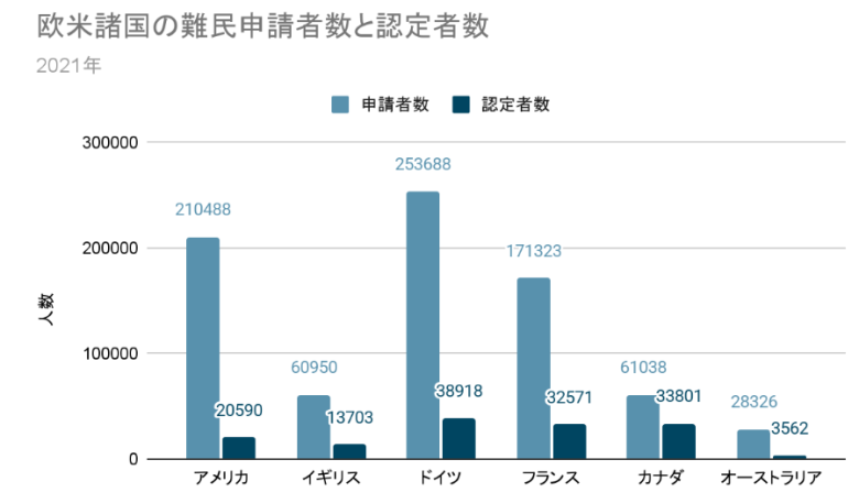 カナダの難民認定率は55.38%、イギリスは56.56%と、いずれも50%を超えています。他の受入国と比較すると、日本の難民認定数が著しく少ないことが、数字からも明らかです。