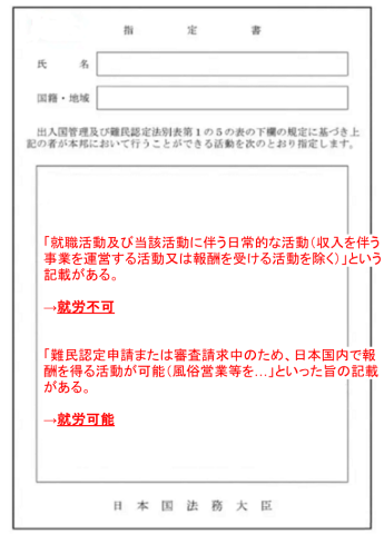 指定書に「就労してはならない」と記載されているか、あるいは具体的な就労活動が許可されているかによって、就労の可否を見分けることができます。