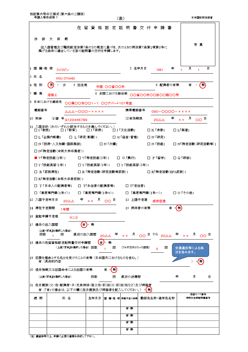 出典:在留資格認定証明書交付申請書(記載例)|出入国在留管理庁