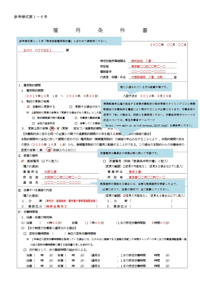 - ○ 雇用契約変更・・特定技能雇用契約に係る届出書(参考様式第3-1-1号)、雇用条件書(参考様式第1-6号、別紙含む)など