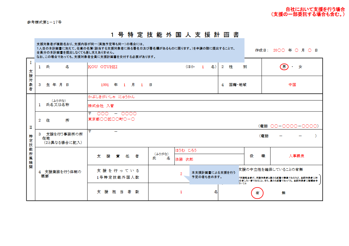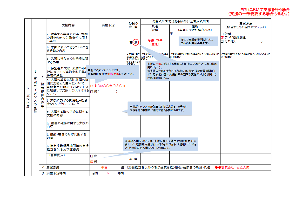 出典:1 号 特 定 技 能 外 国 人 支 援 計 画 書(記載例)|出入国在留管理庁