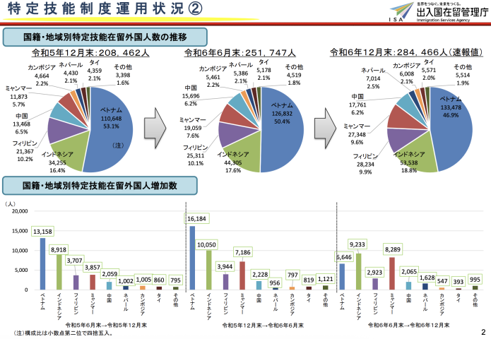 また、出入国在留管理庁による特定技能制度運用状況(令和6年12月末)(PDF : 953KB)によれば、国別に見るとベトナム、インドネシア、フィリピン、ミャンマーが上位国で、特にベトナムとインドネシアからの受け入れが多くなっています。