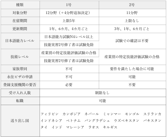 | 項目 | 特定技能1号 | 特定技能2号 |