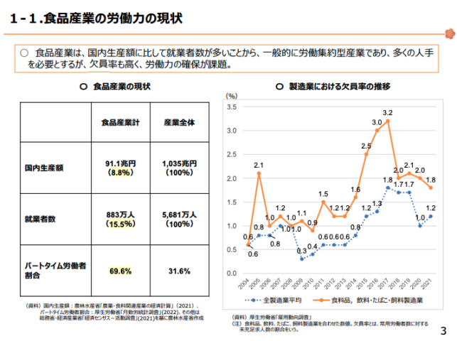 農林水産省「食品産業における労働力確保について」(2023年11月)によれば、製造業における欠員率の推移は下記の通りで食品産業は、多くの人手を必要としながらもその欠員率の高さから、労働力の確保が喫緊の課題となっています。