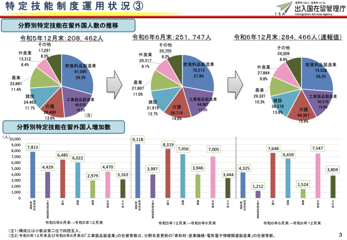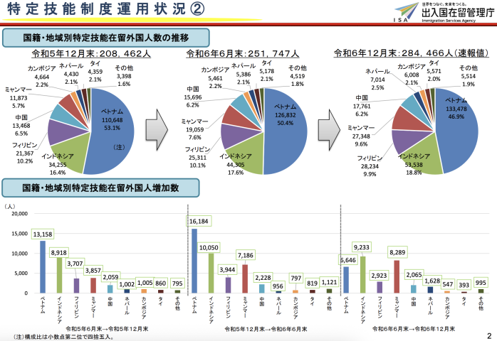 また、出入国在留管理庁による特定技能制度運用状況(令和6年12月末)によれば特定技能外国人の総数は、2024年12月末時点で28万人を超えており、国籍別に見るとベトナム、インドネシア、フィリピン、ミャンマーが多くなっています。