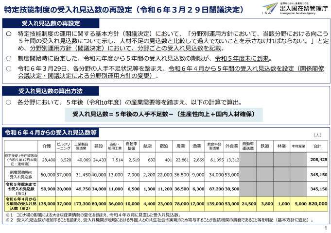 出典:出入国在留管理庁 特定技能の受入れ見込数の再設定及び対象分野等の追加の概要