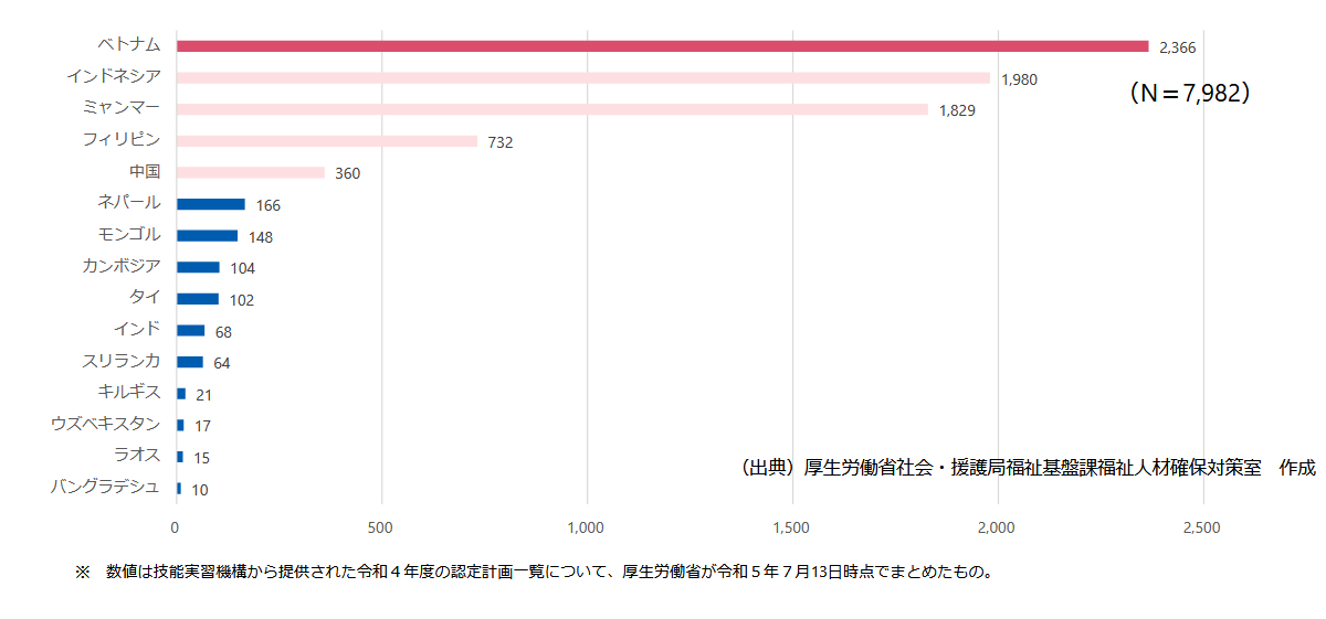 令和4年のデータによれば、主な送り出し国はベトナムが最も多く、次いでインドネシア、ミャンマー、フィリピンなどが上位国でした。