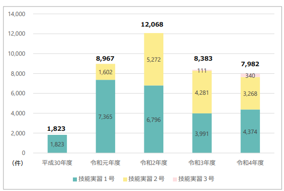 介護分野における技能実習生の受け入れ人数の推移を確認します。