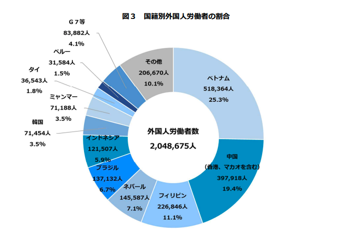 前述したように、国籍別の在留者数では、ベトナム人が最も多く、518,364人で全体の25.3%を占めています。続いて中国人が397,918人(19.4%)、フィリピン人が226,846人(11.1%)となっています。在留資格別の前年同期比増加率を見ると、「専門的・技術的分野の在留資格」が24.2%増加し、「技能実習」も20.2%増加しています。また、「資格外活動」も6.5%増加、「身分に基づく在留資格」も3.5%増加しています。一方で、「特定活動」は2.3%減少しました。